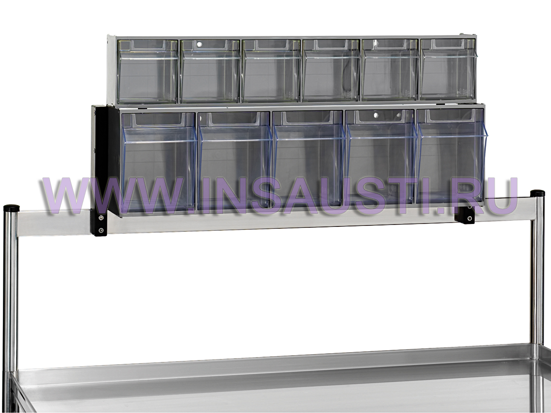 Дополнительно данная модель тележки оснащена надставкой с контейнерами (5+6) из прозрачного поликарбоната, а также правосторонней полкой из ударопрочного полиэтилена. Глубина боковой полки 135мм. Каждый контейнер надставки имеет держатель идентификационной таблички.