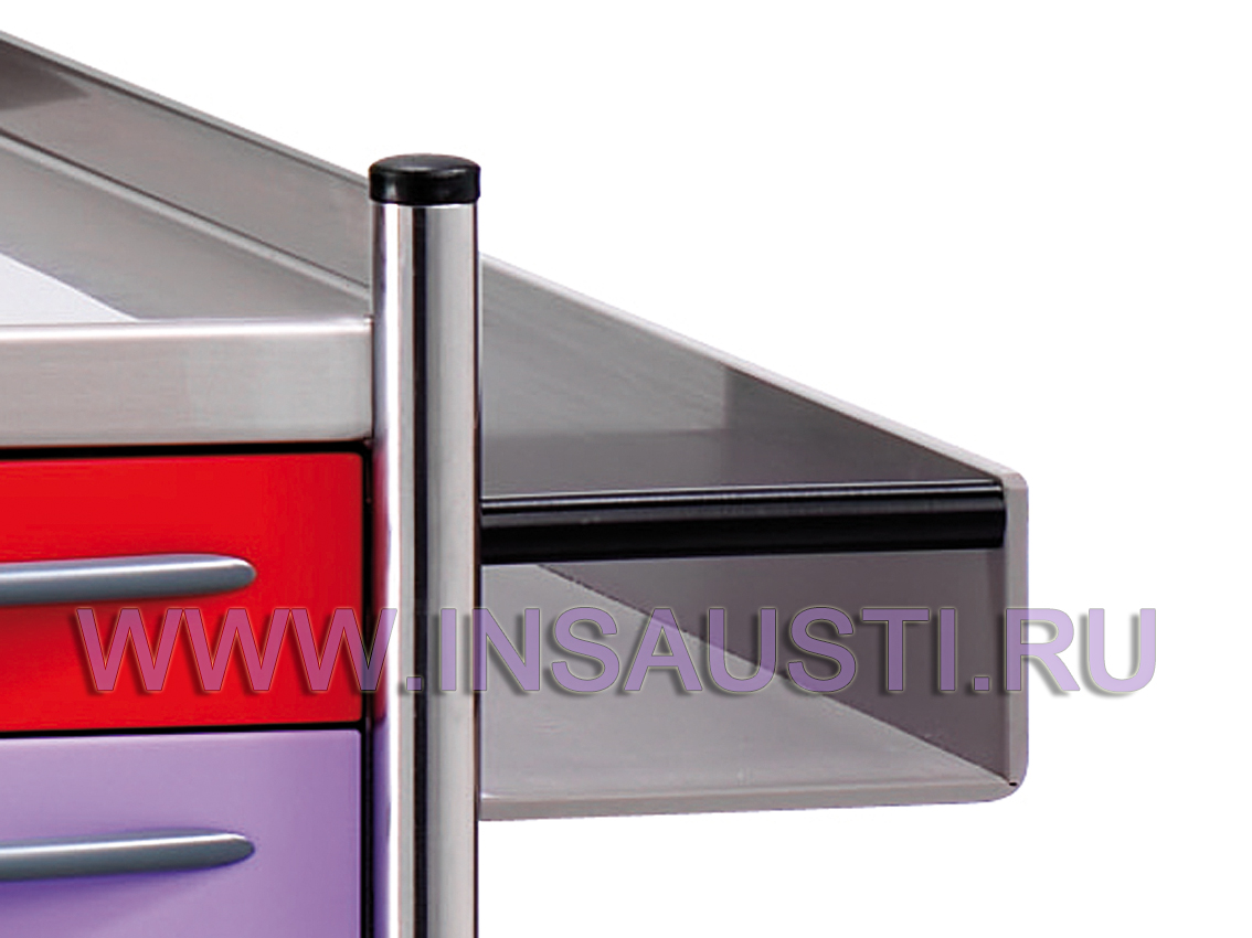 Верхняя столешница может быть выполнена из матированного стального листа толщиной 1,2мм с защитными бортиками по трем сторонам, или из ударопрочного полиэтилена, устойчивого к воздействию спиртов и дезинфицирующих средств с бортиками по всем четырем сторонам.