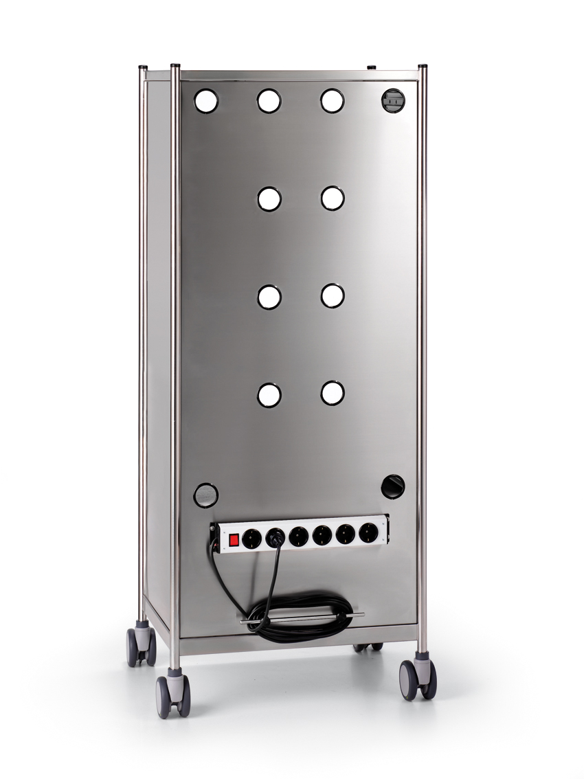 Для подключения максимально необходимого медперсоналу оборудования, данная модель тележки оснащена встроенным блоком питания на 6 евророзеток с кабелем длиной 4м, а также имеет технологические отверстия для коммутации всех питающих проводов с тыльной стороны тележки. Держатель кабеля обеспечивает дополнительную безопасность при транспортировке тележки.