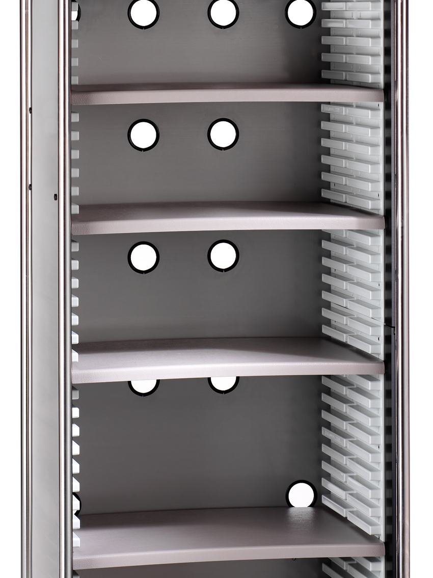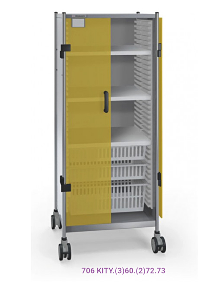 Конструкция тележки обеспечивает возможность установки различного количества полок и выдвижных корзин, а так же их регулировку по высоте, что позволяет оптимизировать внутреннее пространство тележки под конкретные задачи персонала.
