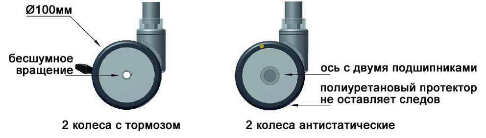 Великолепная маневренность тележки обеспечивается благодаря бесшумным сдвоенным колесам на подшипниках качения. Колеса имеют мягкий протектор, не оставляющий следов на полу. Нагрузочная способность каждого колеса – 100кг. Два из четырех колес антистатические, два – с индивидуальным тормозом.